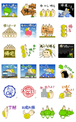 人気の帰るコールのポップアップスタンプ。会社員、愛妻家、社畜、学生さんへ。今から帰るなど、帰る時に家族に送る帰宅連絡に便利。お疲れ様等の返事のおまけ付き