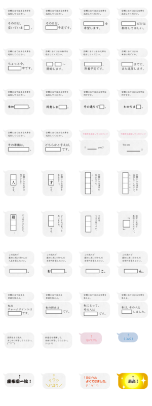 空白を埋めたくなる人間の心理を利用してスムーズな返信を実現するスタンプです。ちょっとした大喜利やアンケートにも使えます。