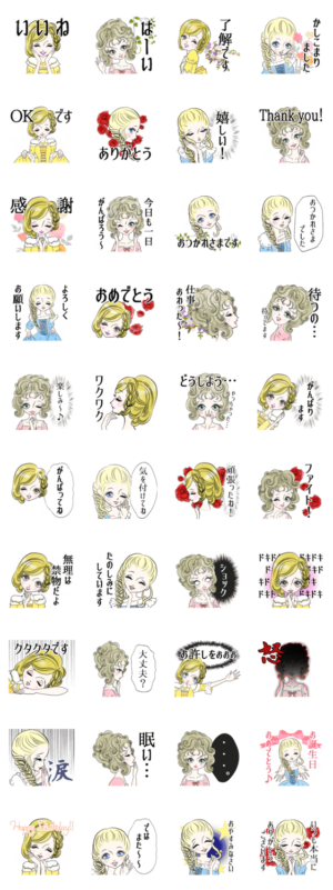 少女漫画のようなキラキラ感、昭和レトロ、、ヨーロッパ風なガーリーさを持ち合わせたスタンプ。日常使いできる昭和感のあるマンガやオシャレなかわいらしさを楽しんでね。