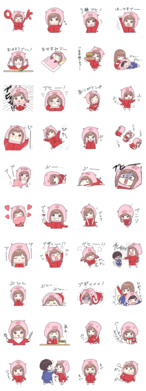 ジャージちゃん第16弾!子豚の被り物をしたジャージちゃんが登場です。普段使える挨拶から面白いスタンプも…?!カップルはもちろん、友達や家族にも送りやすいです♪