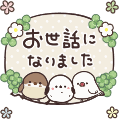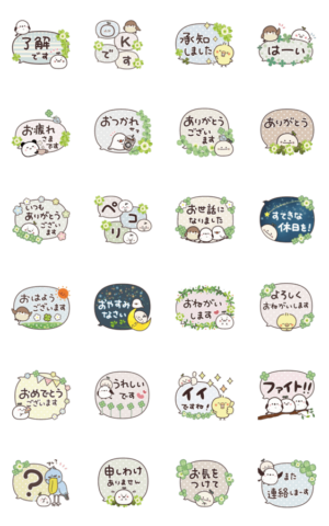 クローバーで飾ったふきだしと、まるいやつらとトリさんのアニメーションスタンプです。敬語が多めで先輩や上司の方にも使いやすくなっています。