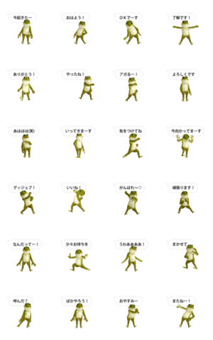 毎日使えるふきだし風の甘〜い気遣いの言葉に添えて、活発すぎるカエルが空気を読まずに動きまくります。