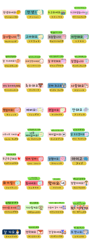 セヨ体中心のハングルスタンプ。よく使う言葉。読み方もあるので勉強にもなると思います。キロンキロン より発売