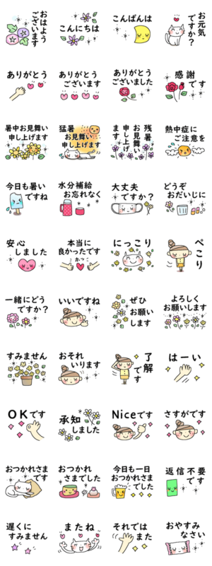 シンプルなイラストと見やすい大きな文字、敬語多めで使いやすい40個。ねこちゃんや花いっぱいの優しい癒し系スタンプです。夏の気づかいや暑中お見舞いも便利です。