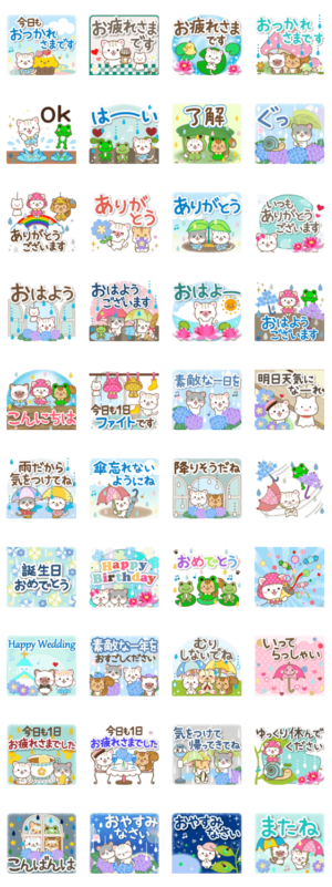 キラキラした雨の世界とお祝いのスタンプです。大人のためアニマルズが輝く雨の世界で毎日を彩ります。梅雨や雨の日、お祝いやジューンブライド(結婚祝い)誕生日。改定版little lion house より発売