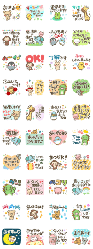 ゆるい絵柄で気軽に毎日使える大人かわいい動物スタンプの5です。挨拶,励まし,気遣い,応援,など、元気のでる明るい言葉をたくさん収録した明るくポップなセットです♪