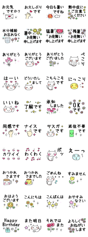 シンプルなイラストと見やすい大きな文字、敬語多めで使いやすい40個。花いっぱいの優しい癒し系スタンプです。夏の気づかいや暑中見舞いも便利です。