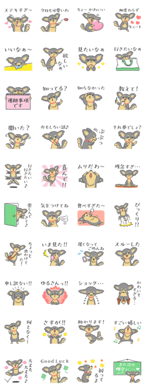 ブラックタンのロングコートチワワ、丸くんの便利なスタンプです。毎日たくさん使えます!ういむい より発売