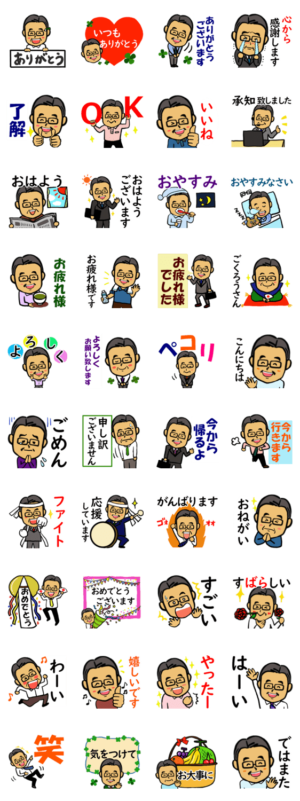 笑顔の中高年シリーズのシンプルな挨拶編。よく使う挨拶を敬語やタメ語などバリエーション多く作成したので、場面によって使い分けでき便利。おじさん、おじいさん、男性