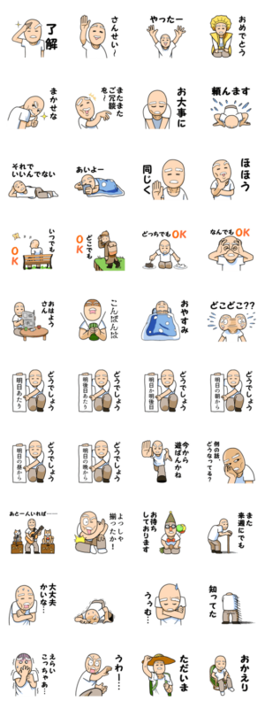 どこにでもいる田舎在住おじいちゃんのスタンプ。 表情豊かで挨拶なども手軽に、和やかに。 田舎に住む人や、いつものグループ、友達などにオススメです。