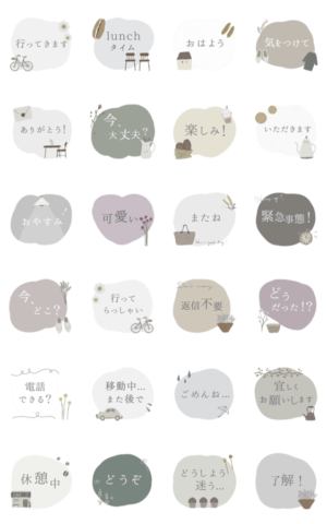 くすみカラーのシンプルで大人かわいい、カフェやドライフラワー・おしゃれ好きさんに使って欲しい日常会話スタンプです♡“敬語編”も是非!オシャレ/ゆるかわ/ちゃこ/花