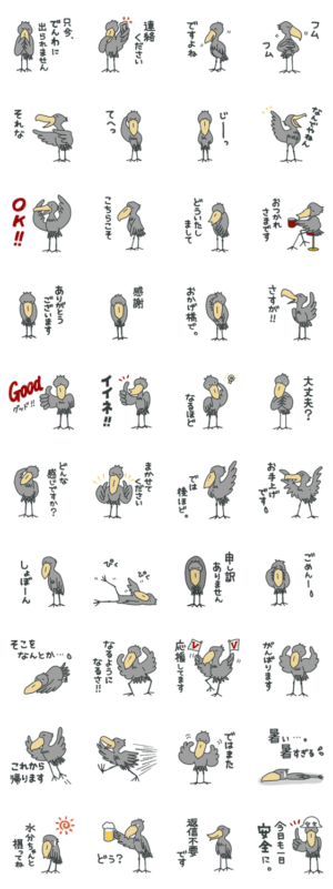 日常会話に便利なハシビロコウスタンプです♪ ご家族、お友達、お仕事関係の方との会話にいかがでしょうか。トマト より発売