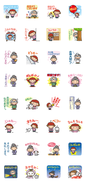シニア世代の為の、使いやすく分かりやすいスタンプです。 「おはよう」から「おやすみなさい」までの、一日の挨拶集。M-michi より発売