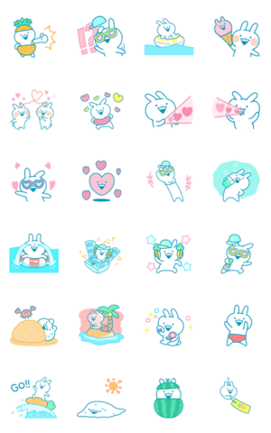 夏も元気いっぱいなうさぎゅーん達です! 今回はハート多め!DJ姿のうさぎゅーんやカニさんも初登場! 君の虜に♫でおなじみの楽曲『summertime』とのコラボスタンプです!くおん より発売