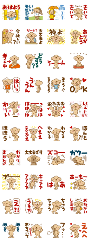限りなく人間に近い犬、トイプードルのぷう太郎の毎日使えるお返事やあいづちをまとめた便利なスタンプです。デカ文字なので見やすいです。