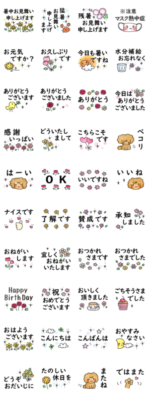 大きな教科書文字とシンプルなイラストが見やすくて使いやすい40個。トイプードルと花いっぱいの癒し系スタンプです。暑中見舞いや暑い夏の気づかいなども便利です。Konko3 より発売