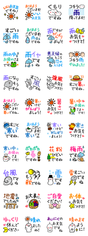 お天気に関する敬語のスタンプです。春夏秋冬、1年中使える!雨/風/暑い/寒い/大人/晴れ/天気予報/てるてる坊主/台風/梅雨/雪/雷/地震/風邪うらら より発売