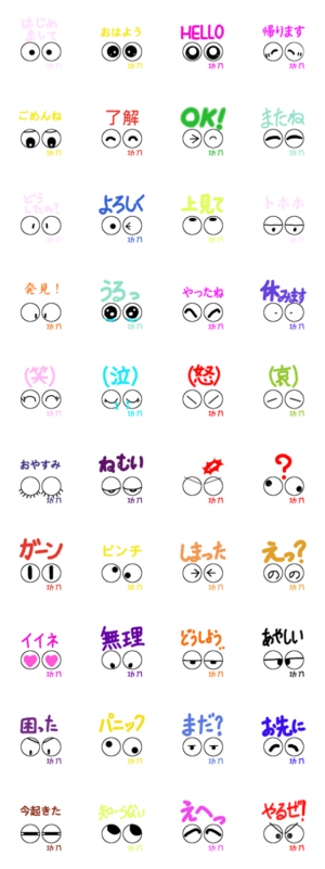かわいい目玉の日常会話・あいさつ・気持ち 了解 はじめまして おはよう HELLO 帰ります ごめんね またね どうしたの? よろしく 上見て OK トホホ 今起きた