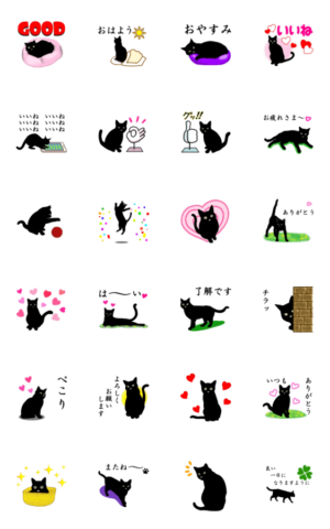 毎日使えるクールな黒猫シリーズのアニメーション編。家族・友達・大人・誰でも使いやすいです。気持ちもシンプルに表現してトークを盛り上げてください♪YUI.A より発売