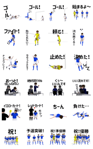 サッカー世界選手権や国際試合で使える日本代表風ポップアップスタンプです。友達やグループで実況しながら応援して盛り上がりましょう。