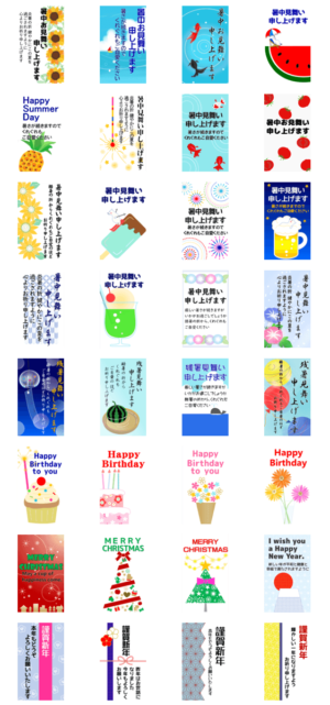 大きなサイズで見やすく分かりやすい挨拶文付き暑中見舞い、残暑見舞い、バースディーカード、年賀状。相手に合わせて色々なタイプの絵柄があります。