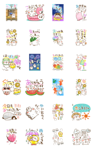 ねことうさぎの名前スタンプシリーズ。新★夏の使いやすいスタンプ。挨拶/暑い/天気/お天気/スイカ/台風/梅雨/花火/七夕/猛暑/残暑/真夏日/ひまわり。山田まぽん作。