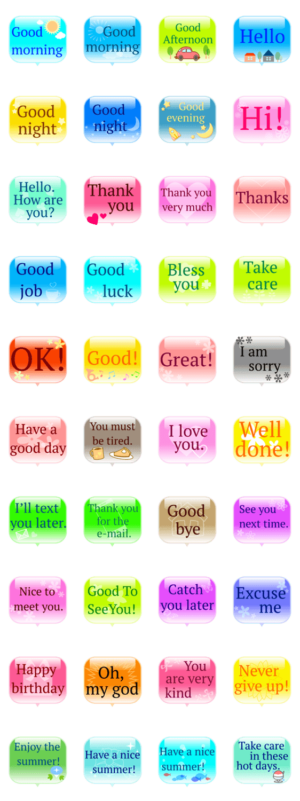 英語の、目にやさしい大きな文字で見やすい、クリアボタンのかわいいあいさつスタンプです。 英会話の勉強や海外のお友達とのやり取りに便利だよ!