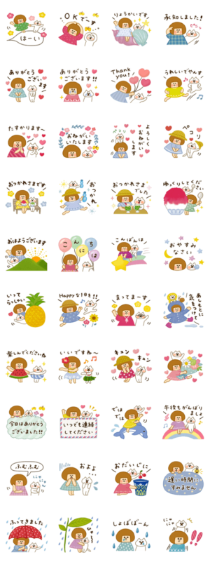 おかっぱハナちゃんとネコの夏に使える敬語スタンプ♪かき氷やパイナップル、スイカ、ラムネ、クリームソーダ♪大好きなものをいっぱい食べて、暑い夏も楽しく涼やかに♡