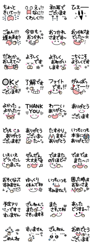 ゆる敬語が中心の日常会話に使える、シンプルな可愛い顔文字スタンプです☆優しく丁寧な言い回しで、仕事仲間やママ友、仲良しのお客様や趣味友にオススメですっ♫
