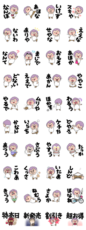 しろめちゃんの3文字関西弁 スタンプに書いてある文字一覧