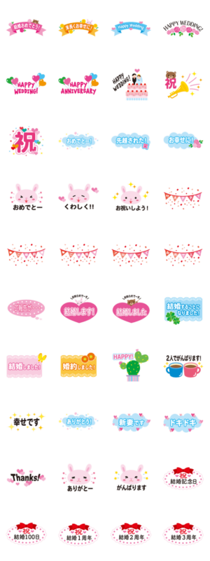 結婚報告、結婚祝いのメッセージ スタンプ画像一覧