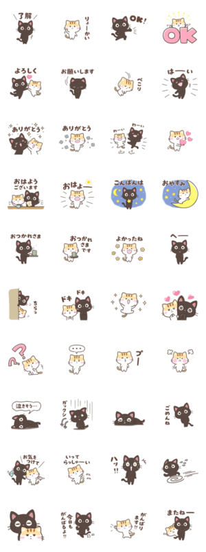 いつもより少しゆるっと可愛い、黒猫のクロと三毛猫のミケのスタンプです。表情豊かになって登場♪