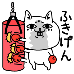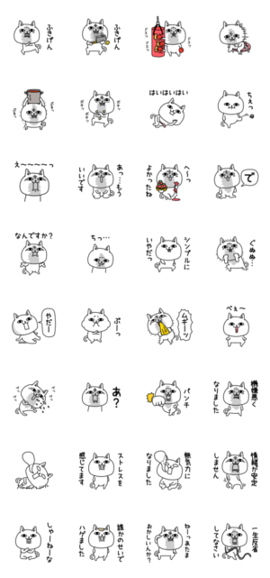 表情が特徴的なねこのスタンプです。ブラックユーモアがいっぱいのスタンプなので、送るときは注意です。