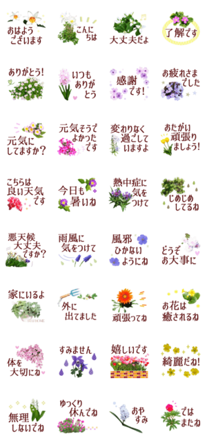 美しい花とよく使う言葉とがセットになったスタンプ。まさに万能選手という言葉がふさわしいもので、ほぼ誰に対しても使うことができます。カジュアルでもビジネスでもOK。とても良いスタンプです。