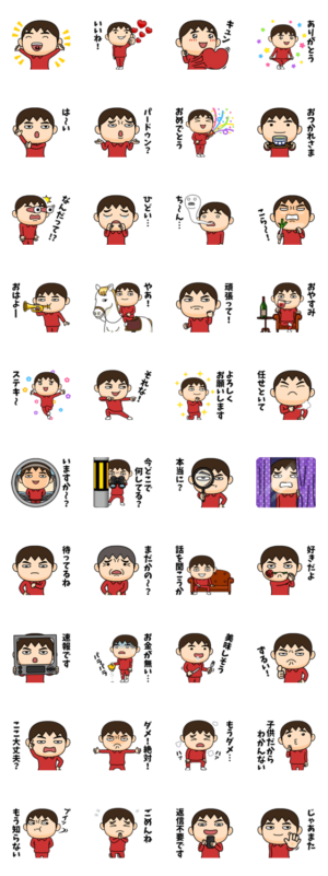 芋ジャージ男子の決めポーズ(静止画スタンプ第1弾)。毎日使える挨拶からネタ満載のスタンプまで全40種類!白馬も登場♪くーが より発売