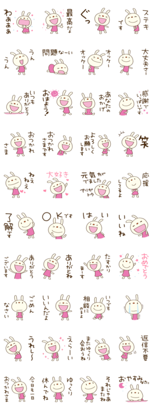 「最高だよ」「いいんだよ」から「あなたのおかげ」まで。ほっこりシンプルな優しい言葉を集めたスタンプ集。てるてるうさぎで、あたたかいメッセージを届けよう。