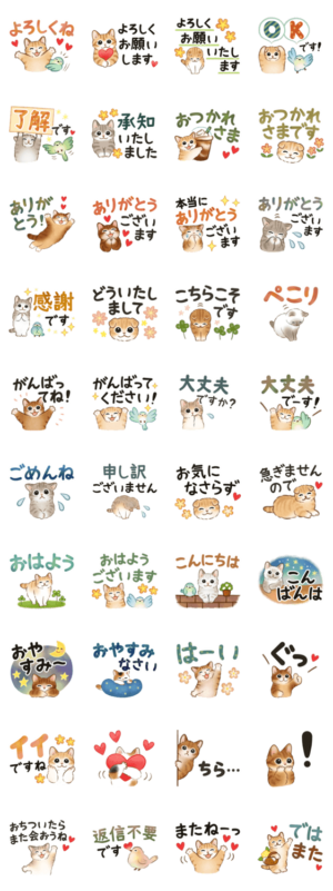 大きい文字で見やすい、ねこたちのスタンプです。友だち同士で使えるものから敬語まで。丁寧でやさしい挨拶・基本のメッセージが多めの、毎日使えるセットです。
