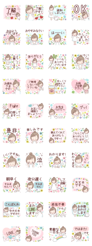 誰にでも送れる女の子の優しく丁寧なかわいいお返事スタンプ。敬語や気遣い、連絡など年齢関係なく使えます。