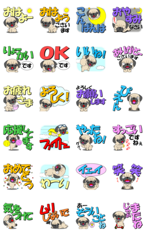 パグの飛び出すスタンプ2 スタンプに書いてある文字一覧