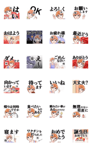 麗しい母スタンプです。なんとなく少女漫画風。デカ文字で見やすい、母子の会話で使いやすいスタンプです。動くよたろ より発売