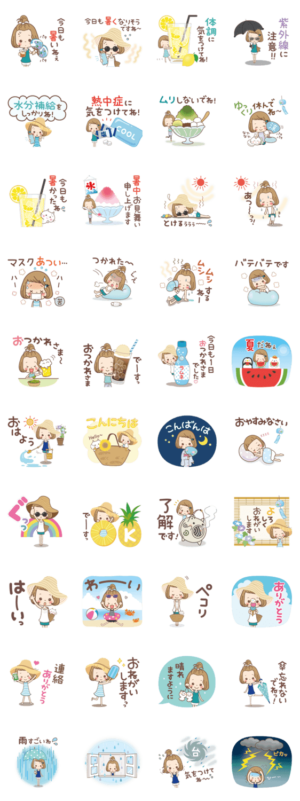 前髪短めな女の子の『夏の気遣い』 スタンプに書いてある文字一覧