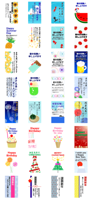 大きなサイズで見やすく分かりやすい挨拶文付き暑中見舞い、残暑見舞い、バースディーカード、年賀状。相手に合わせて色々なタイプの絵柄があります。 ※このスタンプはトークルームで大きく表示されるBIGスタンプです。