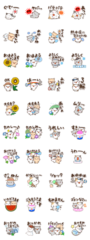 『ちびネコセット』スタンプの【夏】編の第二弾。暑い時期に使えるスタンプや毎日使える言葉を集めました。どなたにでも使える猫スタンプ、ねこ好きの方にぜひ。【かたこ】