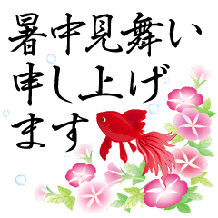 金魚が泳ぎ、朝顔が咲く涼しげな大人の夏の和風エフェクトスタンプ。文字も大きくシンプルで使いやすさ◎ 夏の風物詩で彩られた大人かわいいスタンプが盛りだくださんです