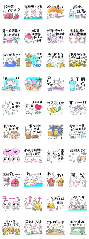花いっぱい、猫とうさぎのやさしい思いやりの夏。文字が大きくて見やすい、毎日使える40個。シンプル短文、感謝や挨拶、気持ち伝わるスタンプです。暑中見舞いも便利です。