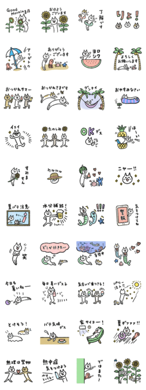 シュッとスリムな猫たちの夏スタンプ。よく使う言葉をたくさん詰め込みました♪
