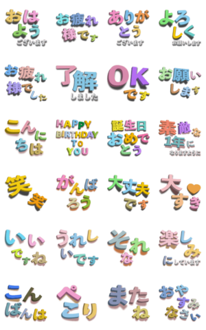 画面いっぱいに広がる大きな文字だけのスタンプです。敬語が多くキャラクターもいないので可愛すぎず無難に誰にでも使える♪使用頻度の多い言葉だけを厳選しました。