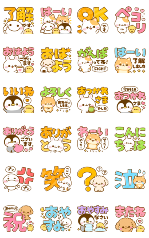 棒人間、ぺんぺん、うさぎのほいっぷ、豆柴日和、といぷーが大集合♡見やすいデカ文字が大人可愛く飛び出すポップアップスタンプです。