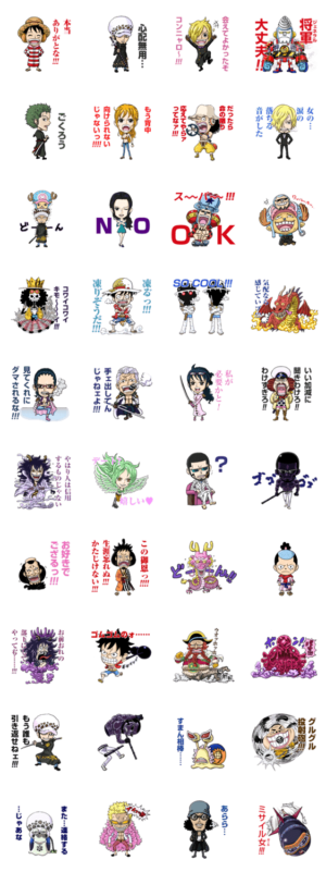 ONEPIECE(ワンピース)パンクハザード編のスタンプです。 ルフィ、ロー、シーザー、ドフラミンゴ、ヴェルゴ、スモーカーなどなどです。