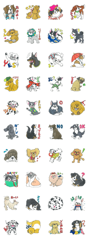 いろいろな犬のともだちが登場するスタンプです。 バーニーズ.ダルメシアン.フレブル.チワワ.プードル.レトリバー.シュナウザー.ドーベルマン.アメコカ.ジャック.シベハスaoki asami より発売